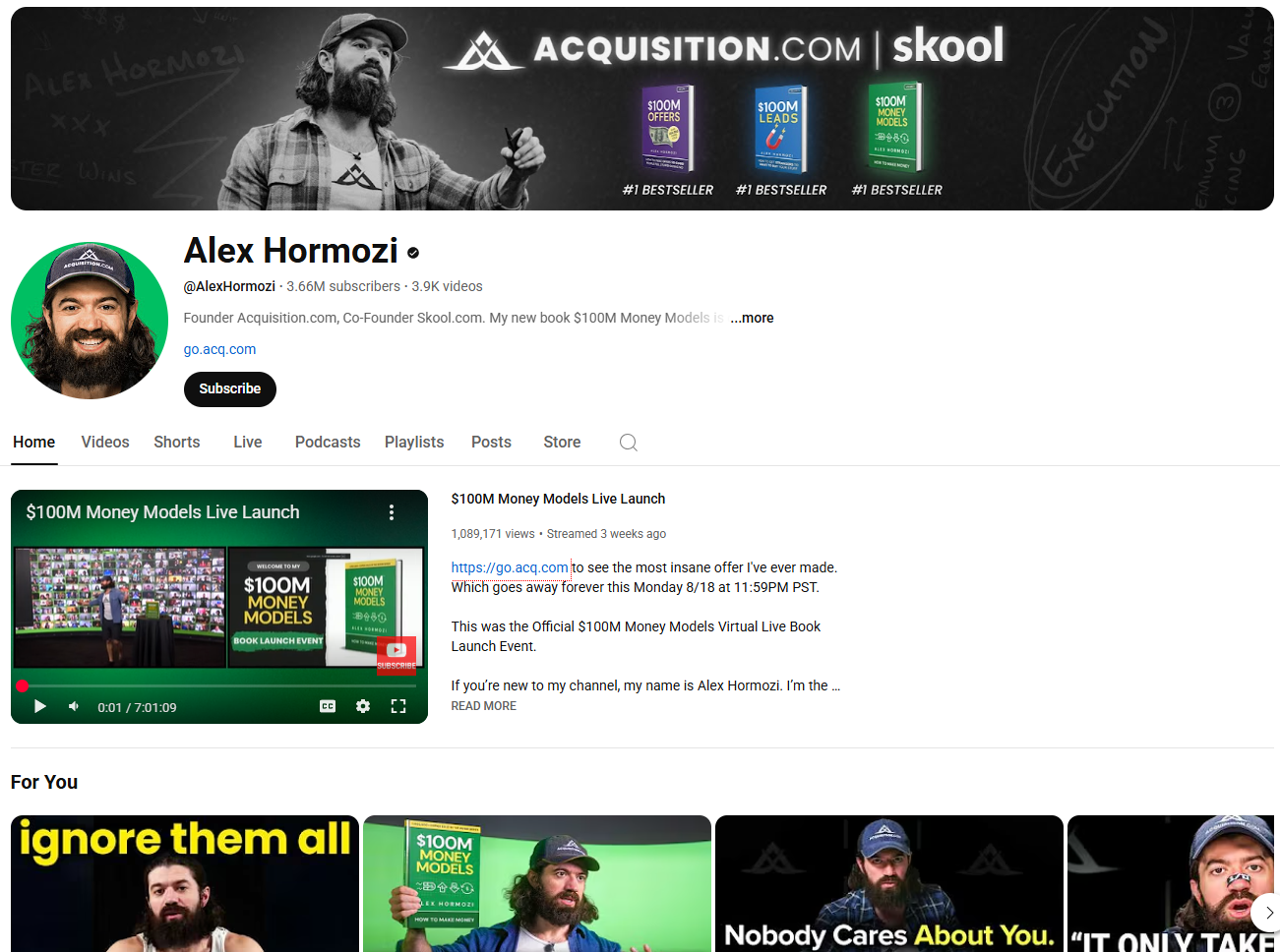 On YouTube, Alex Hormozi turns the pages of his books into whiteboard sessions, teardowns, and frameworks you can implement the same day. No fluff, just levers.
